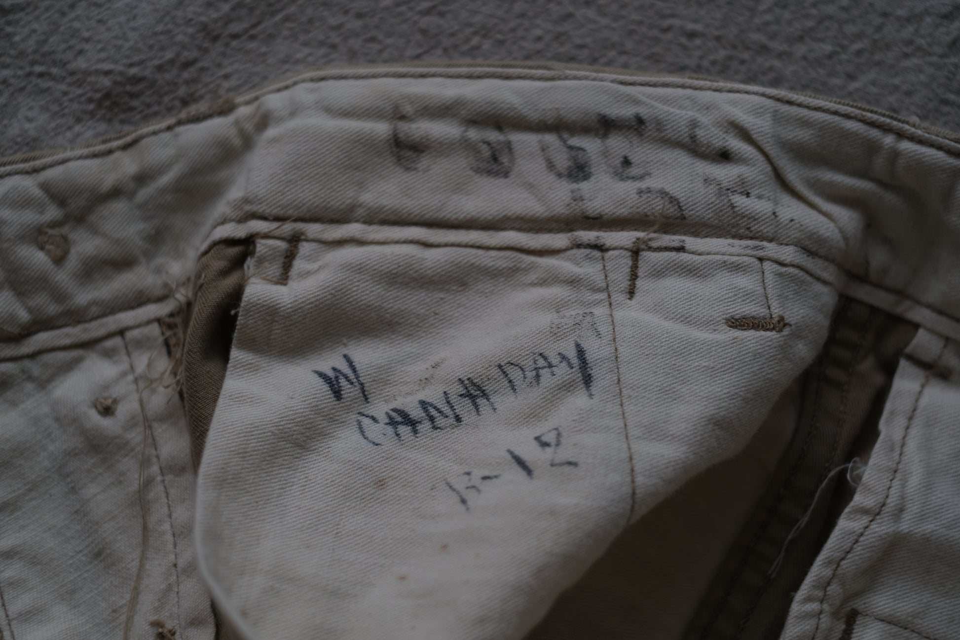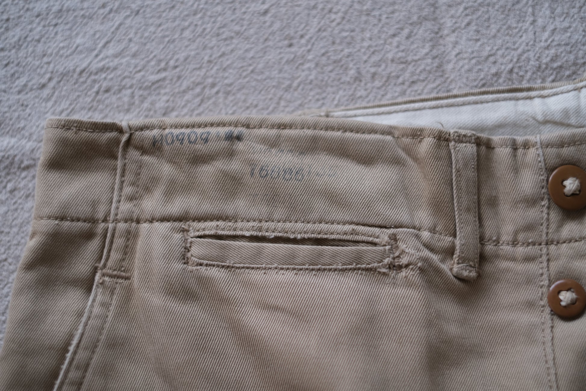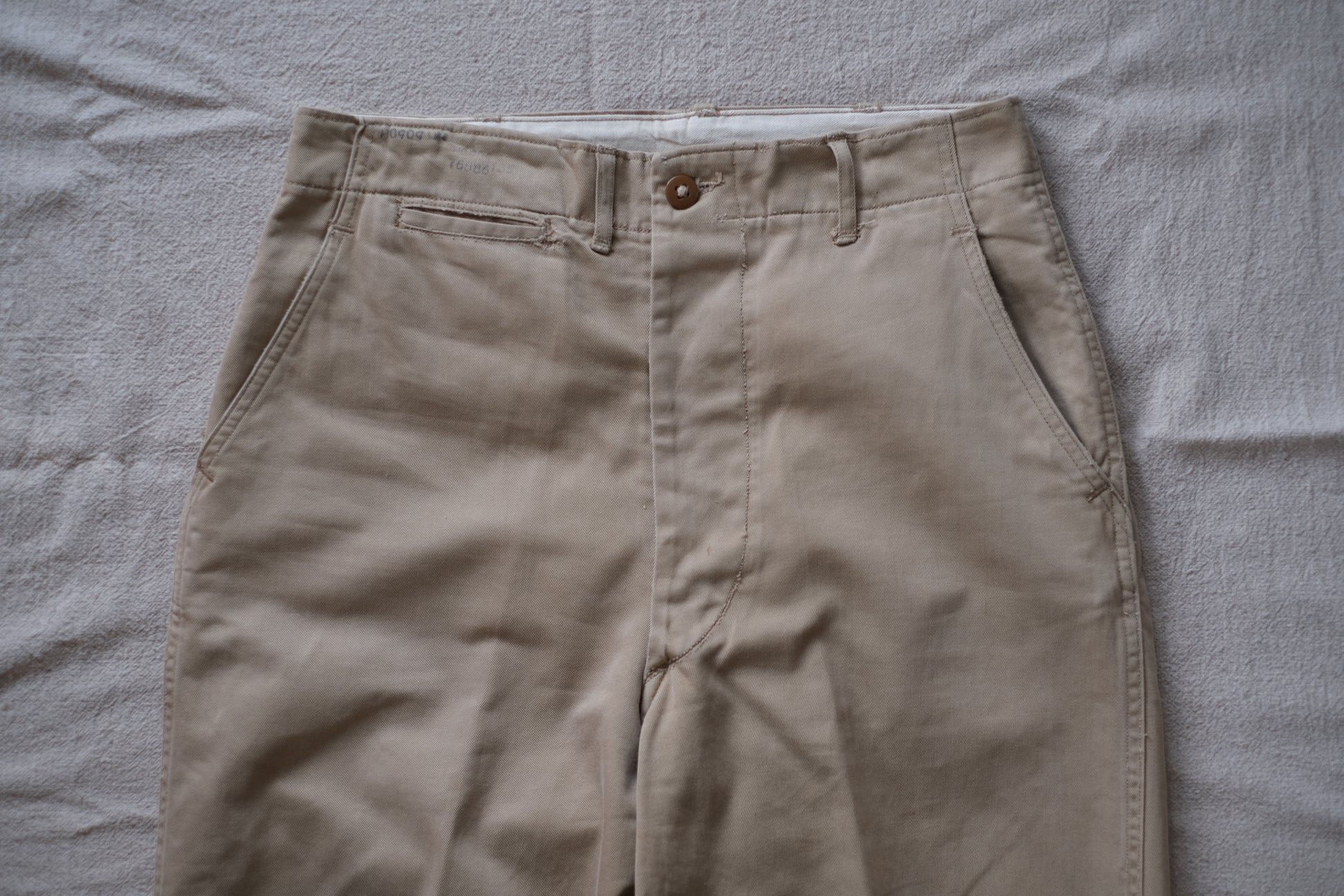 1950年代のUS.ARMY M-45 Chino Trousersです。コットン100%でサイドの縫製はダブルステッチ、フロントは尿素ボタンフライ、細いベルトループにポケットは片玉縁の仕立てです。全体のフェード感、右脚内の薄シミがあるものの、その他目立つダメージ等はなく年代相応の雰囲気のある一本です。