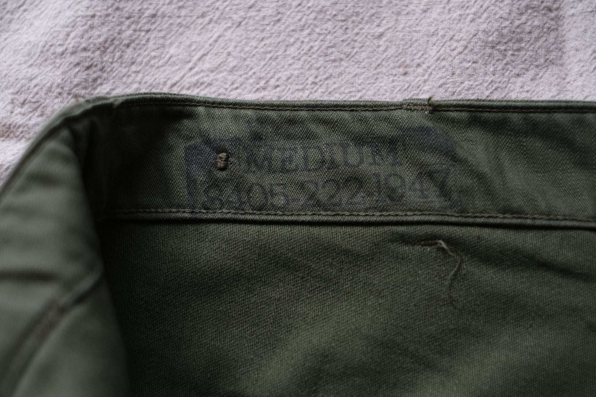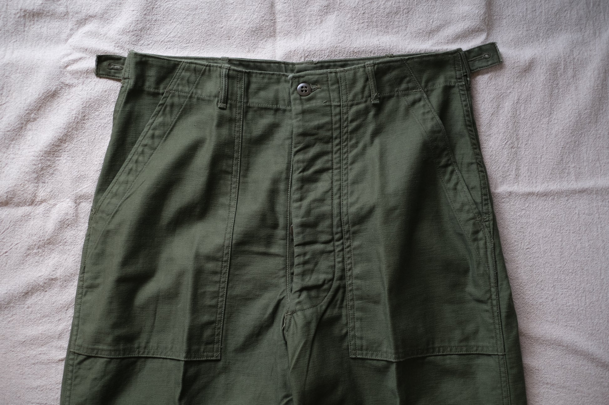1950年代US.ARMYの初期型OG-107 Utility Trousers "Dead Stock"です。コットン100%でポケットやサイドの縫製は、すべてダブルステッチ、フロントはボタンフライ。ウエストはアジャスター付きでウエストを平置きで-3cm程度調整が可能。一度水通しして縮ませていますが、特に傷や汚れなど無い綺麗な未使用品です。