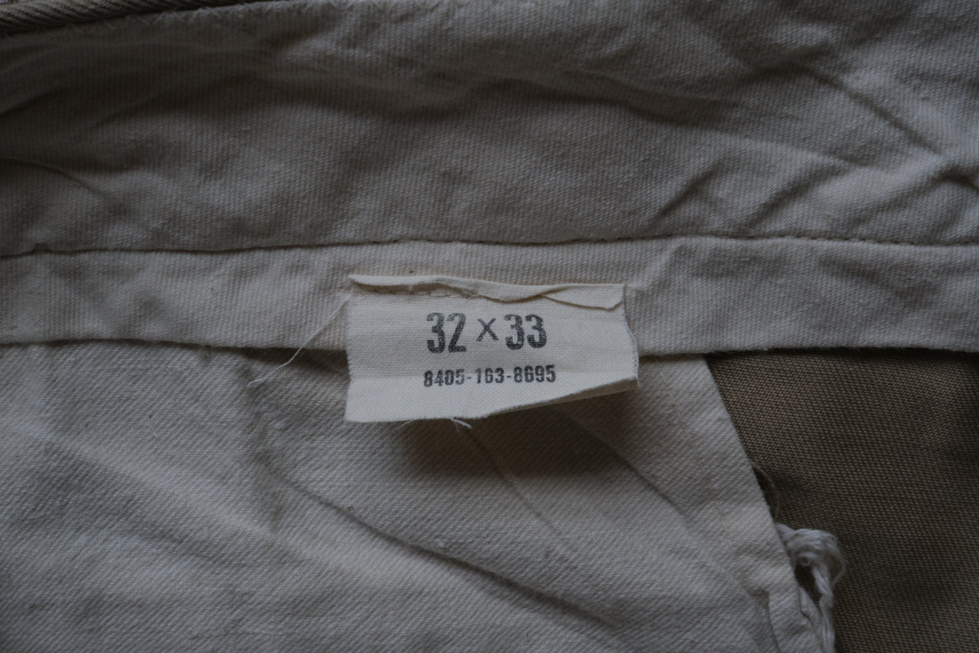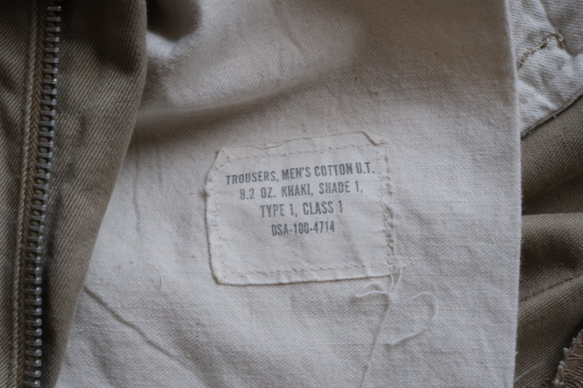 1960年代のUS.ARMY Chino Trousersです。コットン100%でサイドの縫製は割り縫い、フロントはプラスチックボタンにアルミジッパーフライ。太いベルトループにバックポケットは両玉縁の仕立てです。全体のフェード感、ジッパーの前たて下部にピンホールほつれ、左脚首に3cm程度のオイルシミがありますが、その他目立つダメージ等はなく年代相応の雰囲気のある一本です。