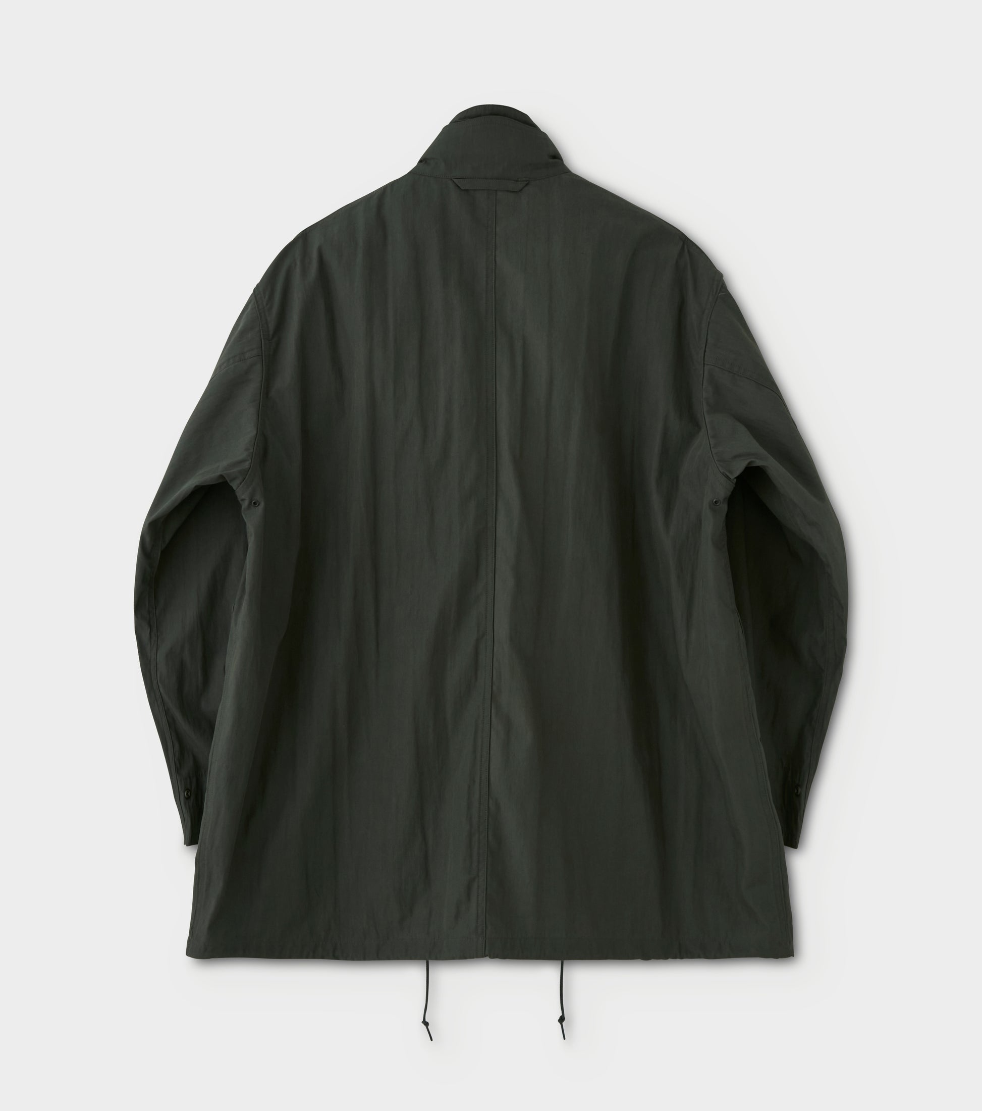 二重襟の内側にはフードを配しており、ミリタリーやアウトドアウェアといった様々なディテールをミックスし、素材を再構築しました。